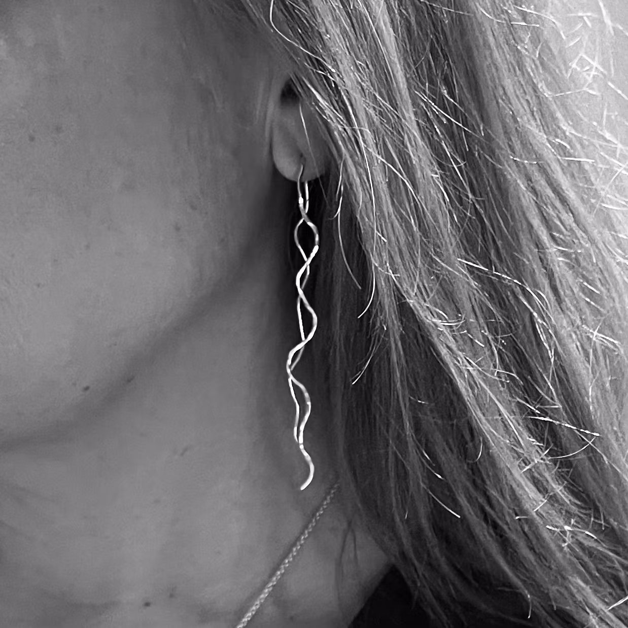 Fjäderlätta och enkla men samtidigt så eleganta! Dessa ljuvliga örhängen med vågor glittrar vackert och dras lätt igenom örat. Välj mellan framsida med hamrad yta för maximalt glitter eller helt slät glansig silvertråd. Kroken och baksidan är alltid slät för bästa bekvämlighet. Då örhängena formges efter hand som de skapas bli varje exemplar helt unikt och kan skilja sig något från bilderna. Örhängena finns i två olika längder.