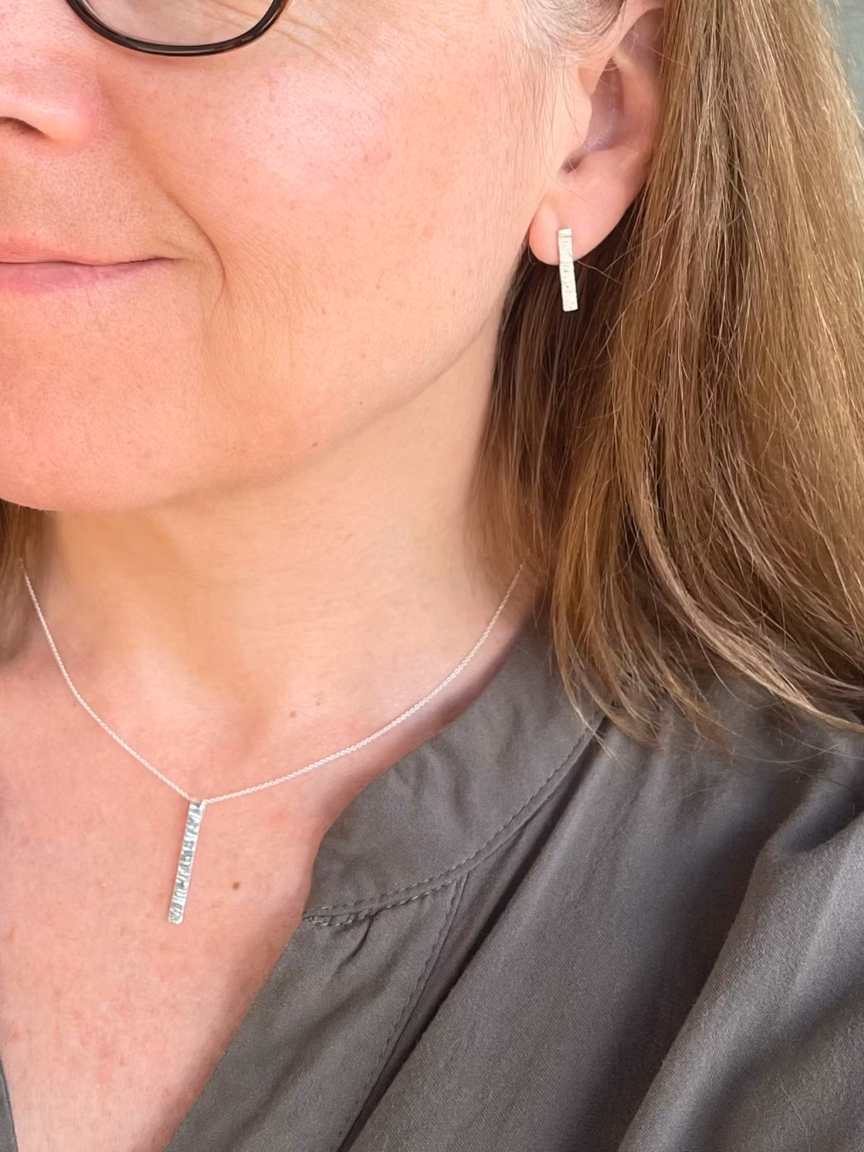 Stilrent halsband med raka linjer och så elegant i sin enkelhet! Hänget är ca 4cm långt och 3 mm brett och finns j två olika utföranden. Ett med små runda hammarslag likt böljor och ett med smala streck som glittrande krusningar på vattenytan. Kombinera gärna med matchande örhängen.