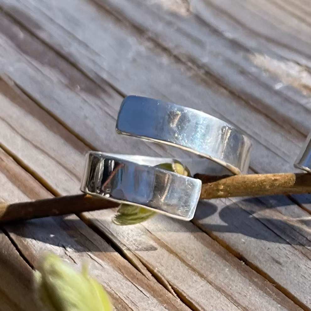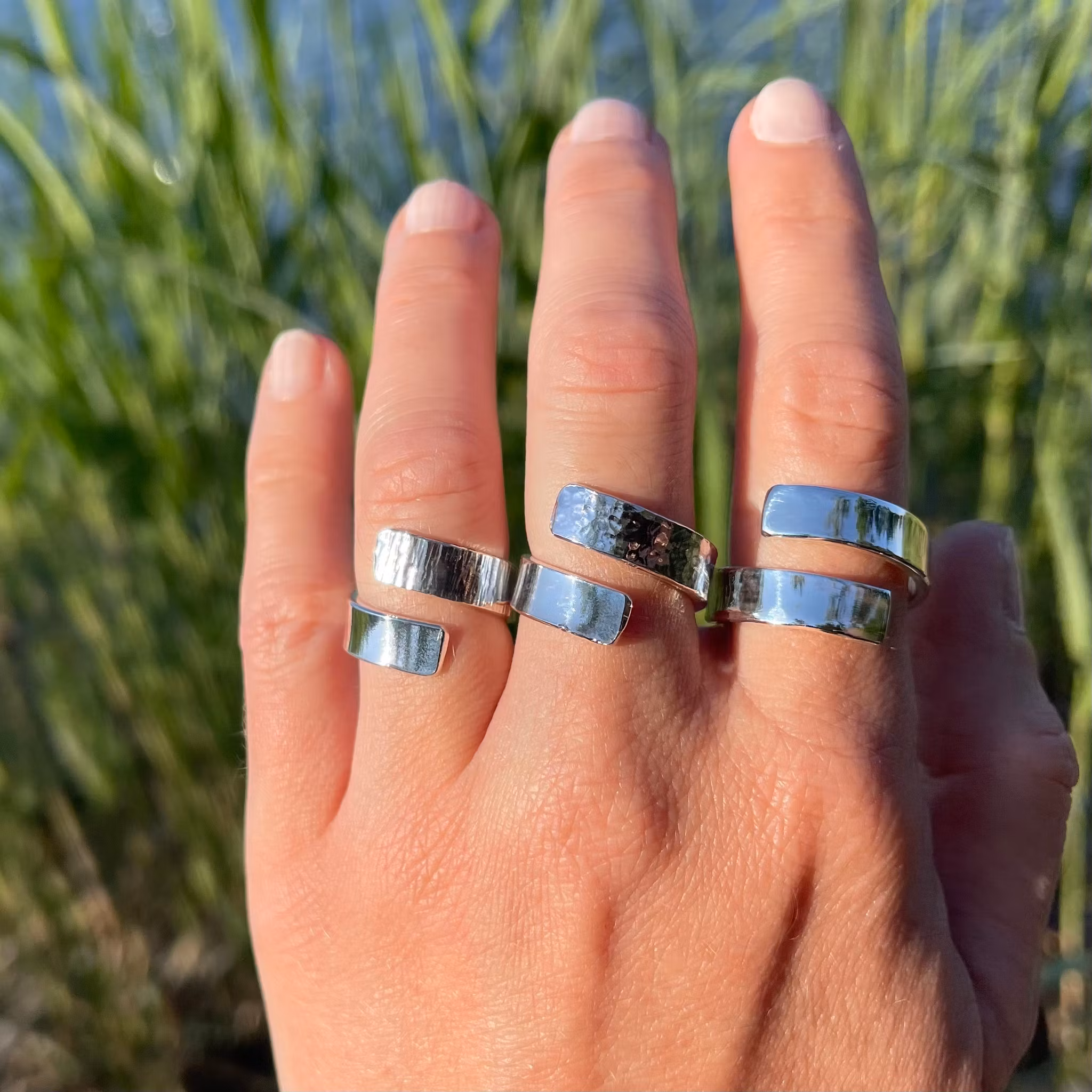 Härligt maffig omlottring som anpassas helt utifrån dina önskemål! Ringen är ca 6 mm bred och 1,5 mm tjock och tillverkas vid beställning. Det går att välja mellan tre olika utförande; 1.) slät, högglanspolerad, 2.) små runda eller 3.) smala streckliknande hammarslag. Välj mellan att få hela ringen i vald yta eller två olika. På bilderna är två av ringarna hälften släta, hälften hamrade i två olika utföranden. Lämna ett meddelande vilken storlek och vilket utförande du önskar!