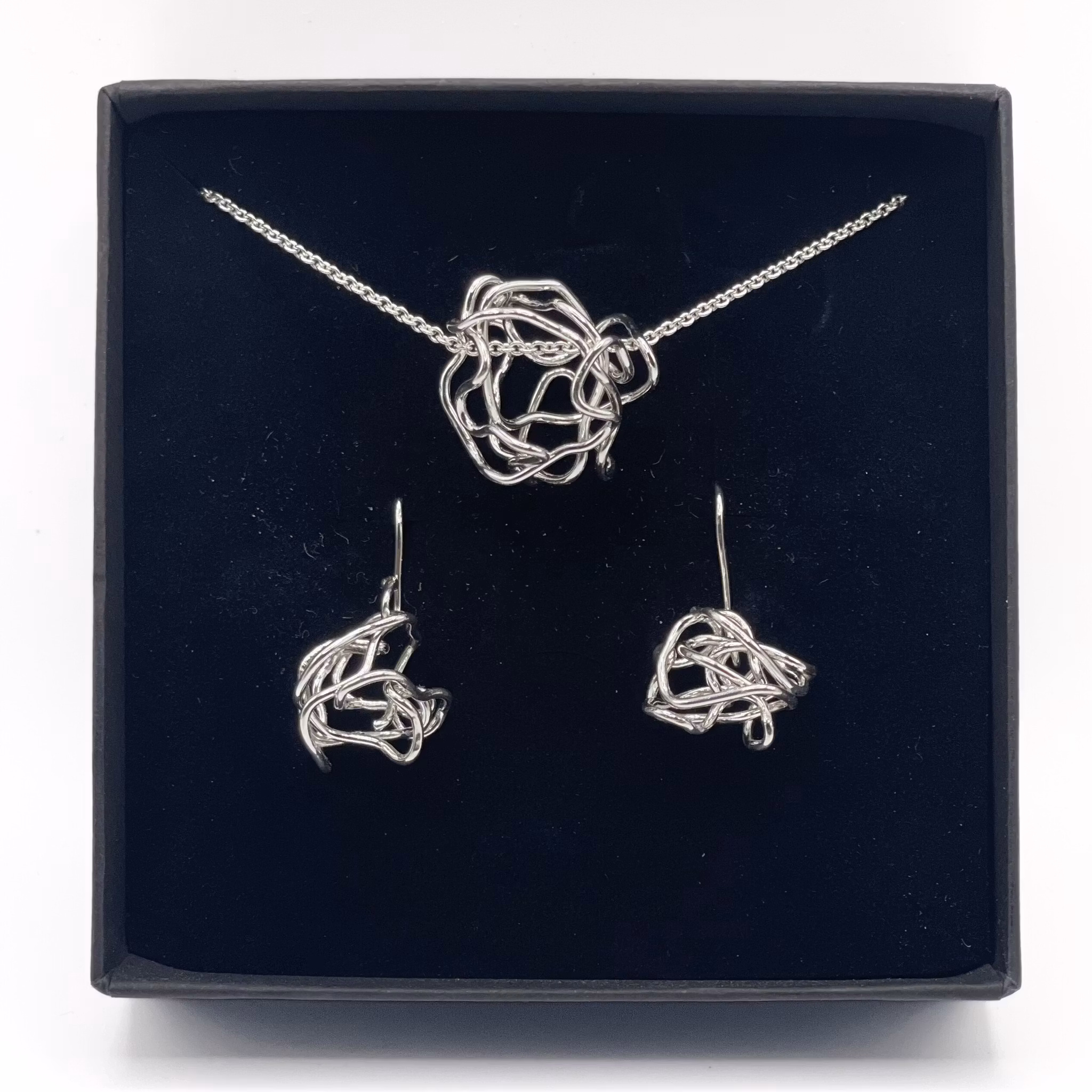 Detta set med våra älskade nystansmycken är både unika och tidlösa. Nystanhalsband modell mellan som hänger i en 50cm lång kedja och små nystanörhängen, ca 1cm. Då alla skapas för hand blir varje exemplar helt unikt. Set pris 1795kr (ord. 2190kr)